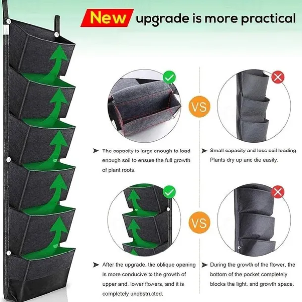 – The hanging flower pot has a new 6-pocket design with large and deep pockets that allow healthy plant root growth without hindering the plant’s growth.
