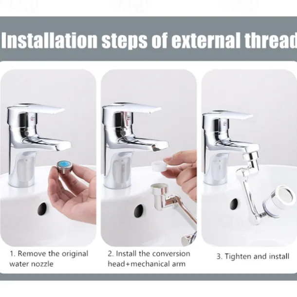 - 【Size】Universal 1080 swivel robotic arm swivel extension faucet aerator fit 3 different design thread. For male 15/16”(24mm),for female 55/64”-27T(22mm), for female G1/2 (20mm)G1/2 (20mm). Compatible with Most Household Sink Faucet Extender.