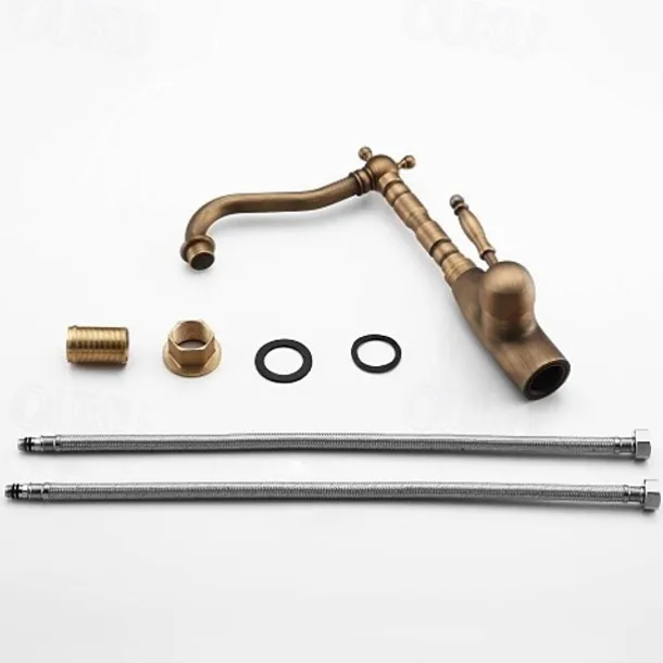 Kitchen Sink Mixer Faucet Traditional, 360 Rotating Kitchen Vessel Taps Antique Brass Retro Style Single Handle One Hole with Hot and Cold Water Hose