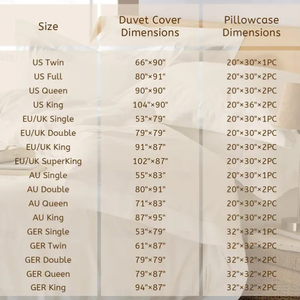 | Size | AU Double, EU / UK Double, EU / UK King, EU / UK Single, US Full, US King, US Queen, US Twin |