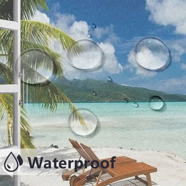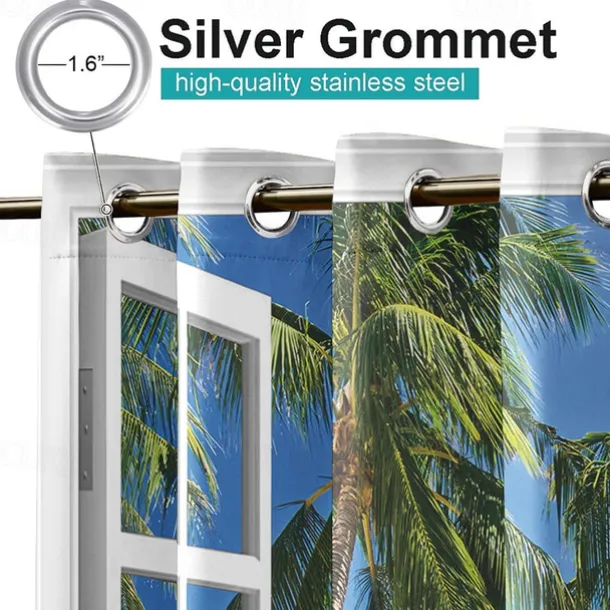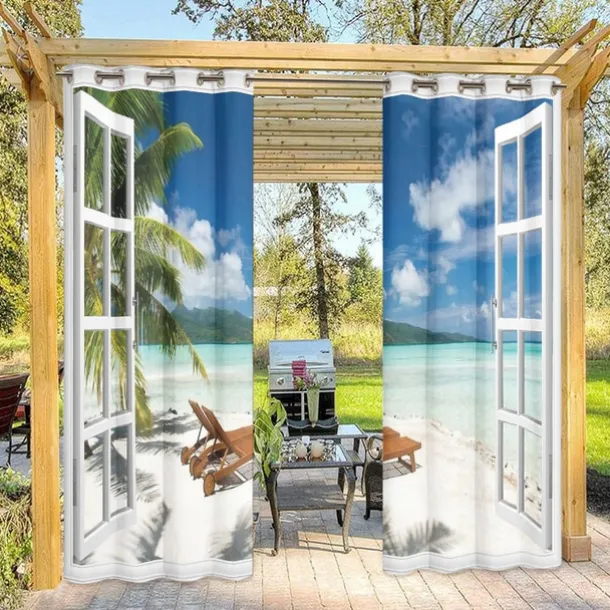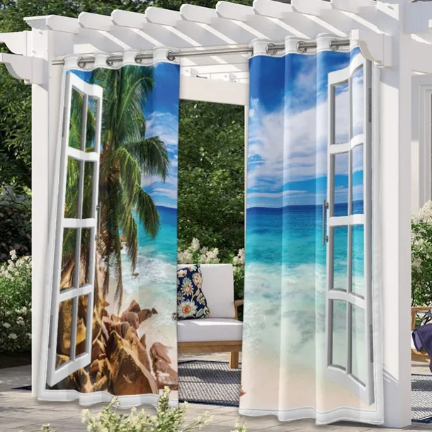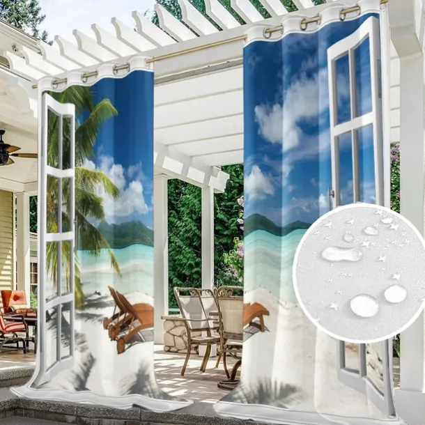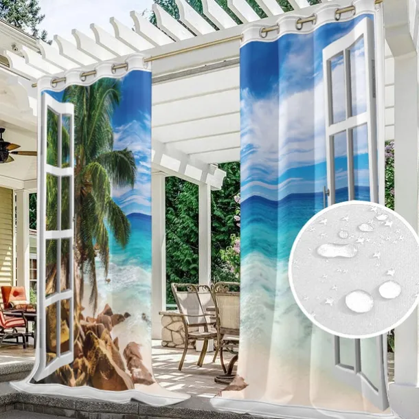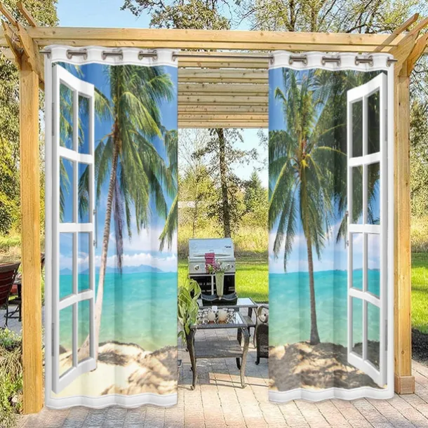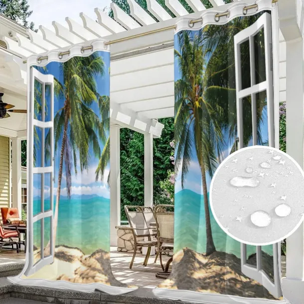 Outdoor Curtains Waterproof Windproof Weatherproof Curtain for Patio, Cabana, Porch, Pergola and Gazebo, Grommet Top Drape, 2 Panels Beach Palm