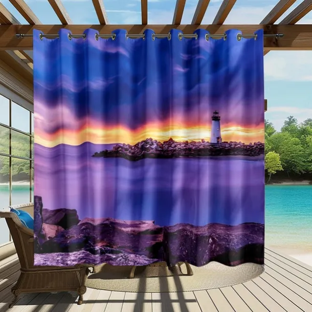 Waterproof Outdoor Curtain Privacy, Sliding Patio Curtain Drapes, Pergola Curtains Grommet 3D Ocean Light Tower Landscape For Gazebo, Balcony, Porch, Party, 1 Panel