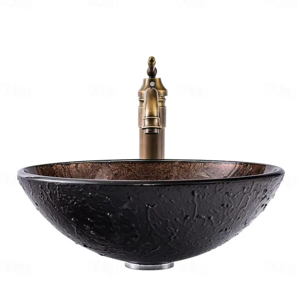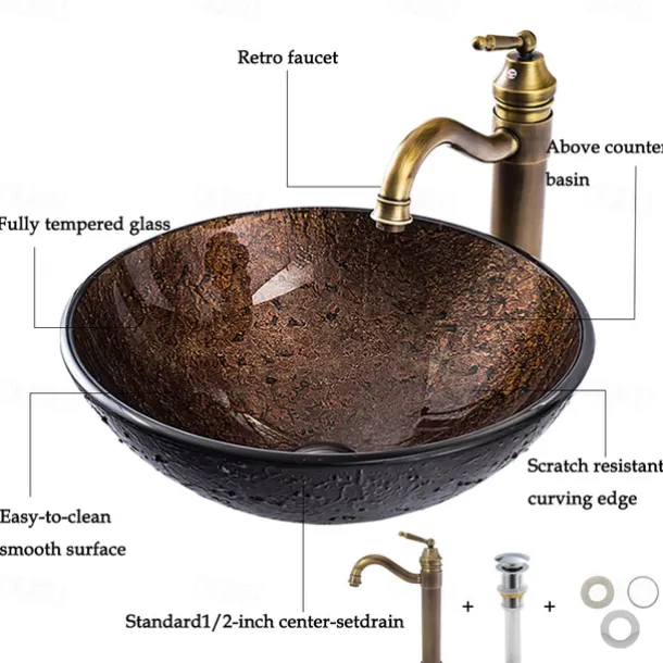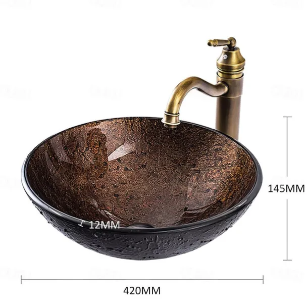 Style: Antique, Sink Finish: Tempered Glass, Faucet Finish: Chrome, Water Drain Finish: Chrome, Mounting Ring Finish: Chrome, Sink Material: Tempered Glass, Mounting Ring Material: Brass, Sink Shape: Round, Faucet Body Material: Zinc Alloy, Net Weight (kg): 9, Shipping Weight (kg): 14.7456, Dimension (cm): 12*420*145, What’s in the box: Bathroom Sink, Bathroom Water Drain, Bathroom Mounting Ring, Bathroom Faucet,