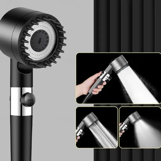 1pc Black Pressurized Handheld Shower Head, 3 Modes Adjustable Water Output Shower Head, Round Massage Shower Head, Bathroom Hardware, Bathroom Accessories