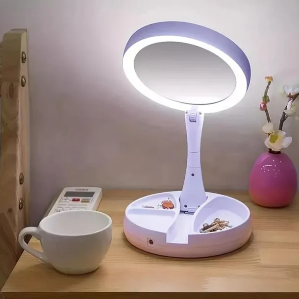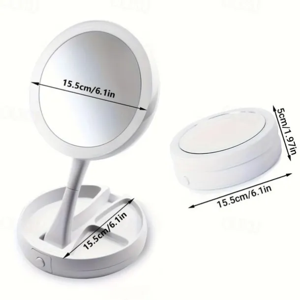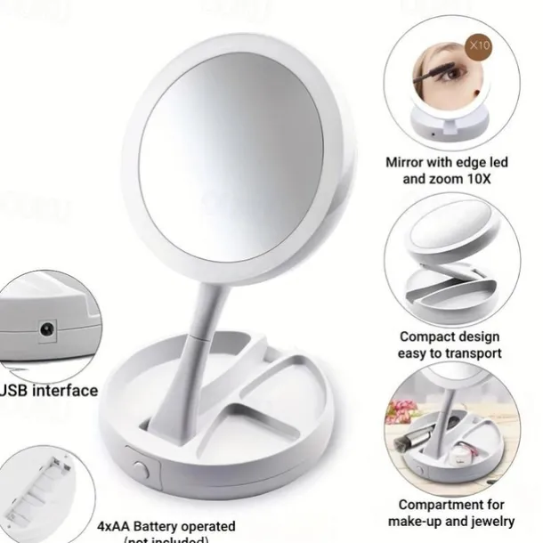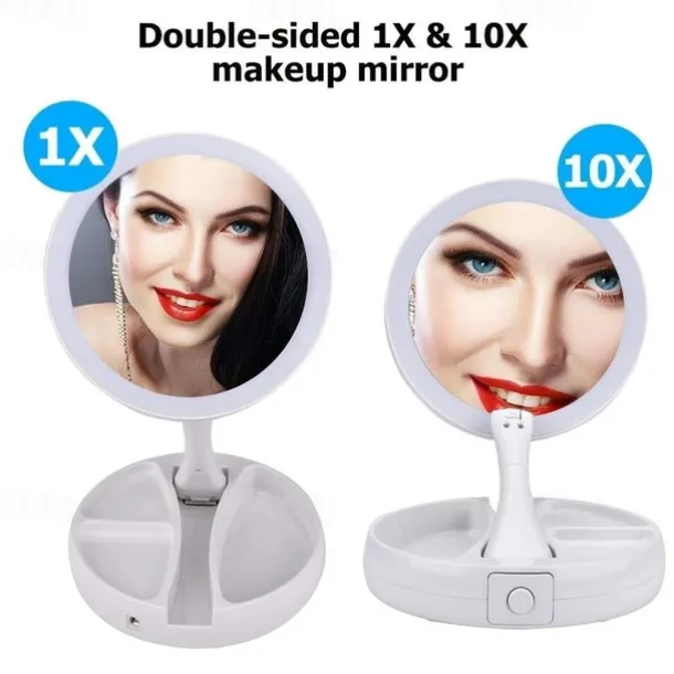 1pc Foldable Makeup Mirror With Led Light Storage Box Organizer, Double Sided 1X & 10X Magnifying Retractable Mirror For Table, Vanity, Cosmetic