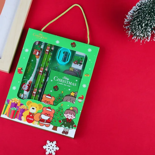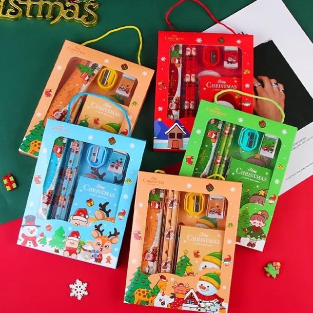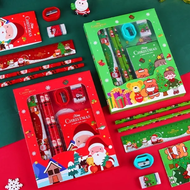 6pcs/set Christmas Portable Stationery Gift Box Set Contain 2 Pencils 1 Pencil Sharpener 1 Eraser 1 Ruler 1 Sticky Note Paper For Primary School Student Children Learning Gift Award