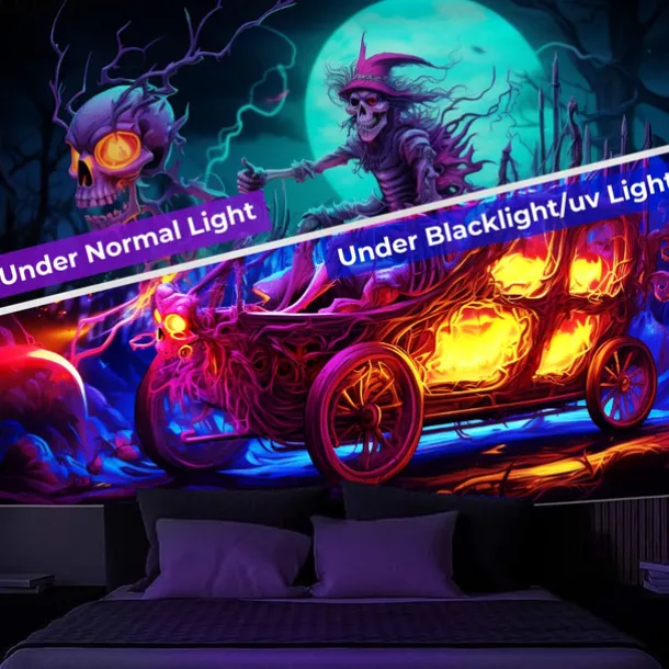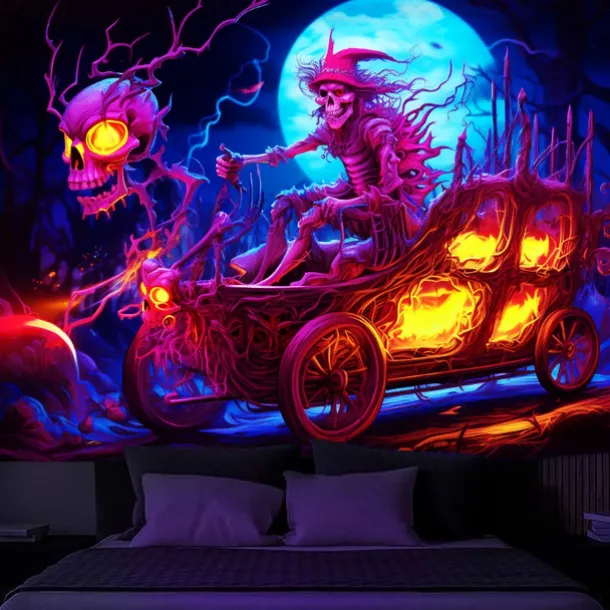 Halloween Blacklight Tapestry Skull Car UV Reactive Glow in the Dark Glow Party Psychedelic Trippy Misty Hanging Tapestry Wall Art Mural for Living Room Bedroom