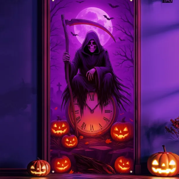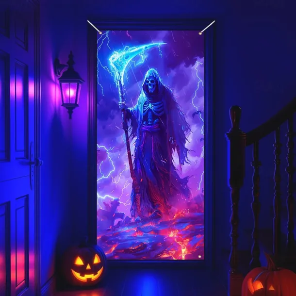 Halloween Door Cover Neon Grim Reaper with Lantern Banner, Glowing Blacklight Entrance Decoration for Outdoor & Indoor 2025 Halloween Bedroom, Living Room, Bathroom