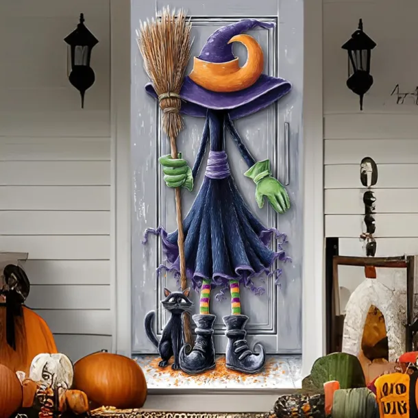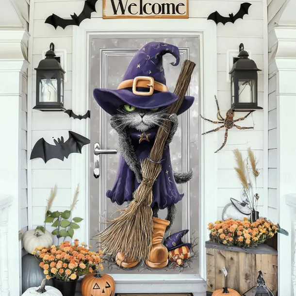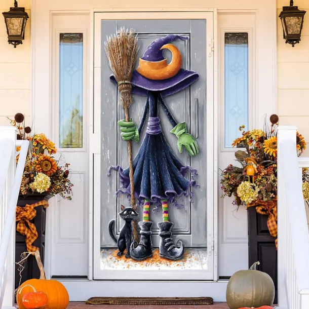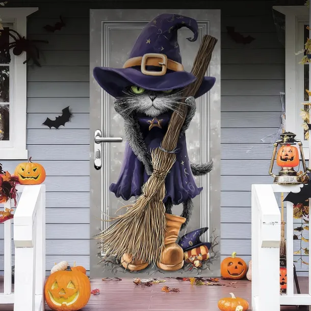Halloween Door Cover Outdoor Banners Witch Cat Psychedelic Dark Punk Gothic Style Party Outdoor Shooting Backgrounds Front Door Wall Porch Decorations Wall Door Background
