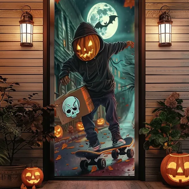 Halloween Door Cover – Pumpkin Head Skeleton under Full Moon, Haunted House Entrance Banner, Scary Outdoor & Indoor Decoration for 2025 Halloween Bedroom, Living Room, Bathroom