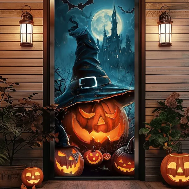 Halloween Door Cover – Stacked Pumpkins with Witch Hat and “Happy Halloween” Sign, Haunted House Entrance Banner, Outdoor 2025 Halloween Decoration for Bedroom, Living Room, Bathroom