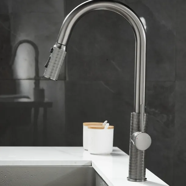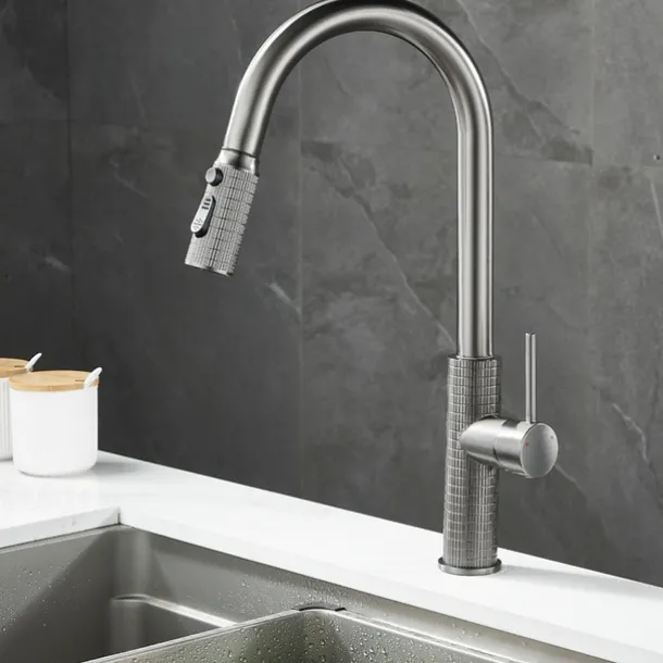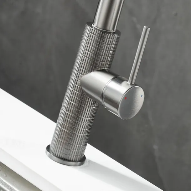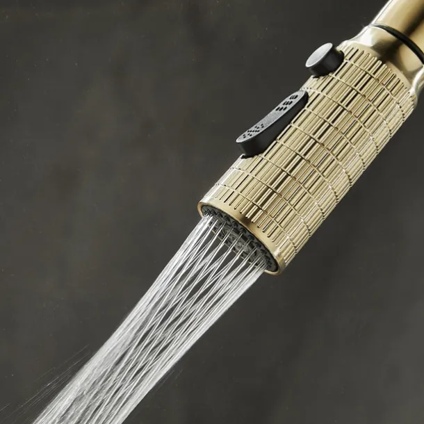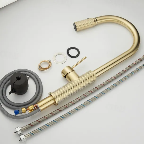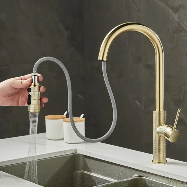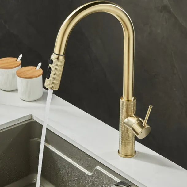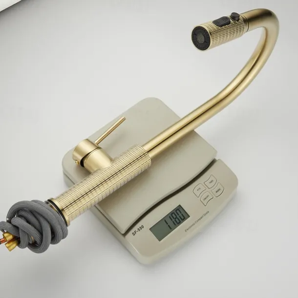 Type: Pull-out / Pull-down, Style: Modern Contemporary, Features: Rotatable, Faucet Type: Kitchen faucet, Installation Type: Mount Outside, Cold and Hot Switch: Yes, Valve Type: Ceramic Valve, Finish: Electroplated, Brushed Gold, Installation Holes and Handles: Single Handle One Hole,