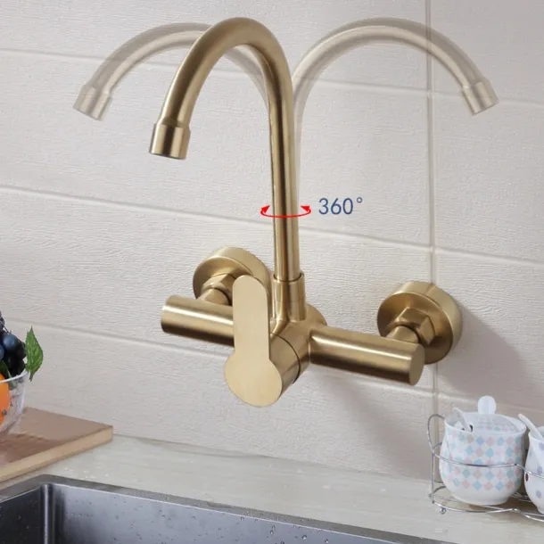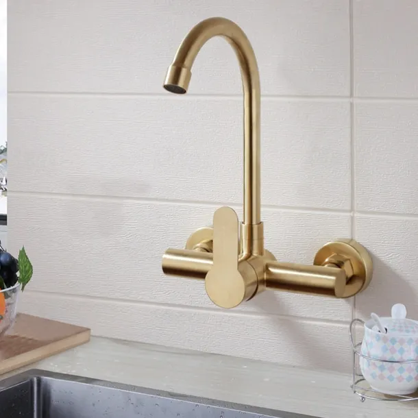 Kitchen faucet – Single Handle Two Holes Brushed Gold Tall /High Arc Wall Mounted Contemporary Kitchen Taps