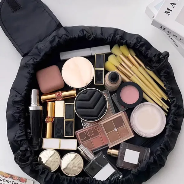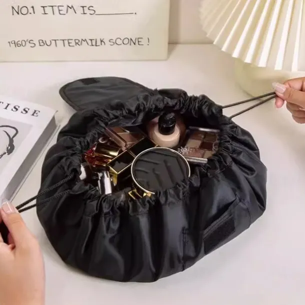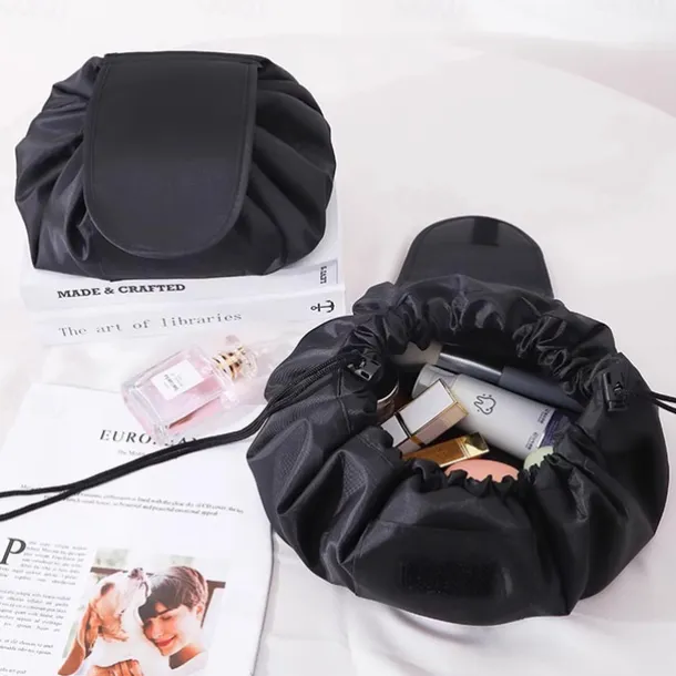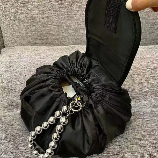Magic Cosmetics Pouch Black Drawstring Cosmetic Bag for Women, Portable Waterproof Makeup Bag Organizer with Pearl Handle Chain, Travel Toiletry Beauty Case