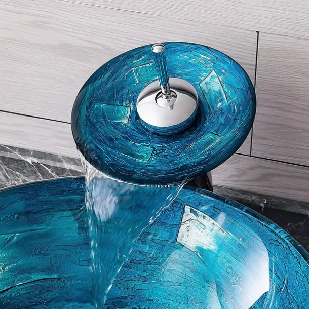 Minimalist Mediterranean Wind Round Basin Tempered Glass Wash Basin With Waterfall Faucet Basin Support Drainer