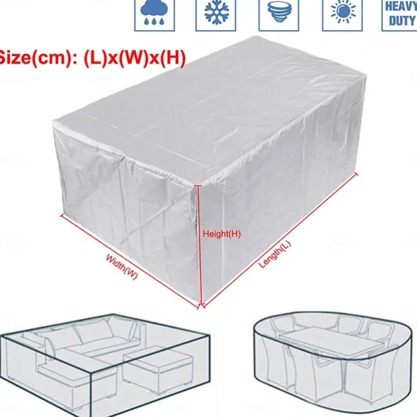 – Garden covers are suitable for large indoor and outdoor furniture such as tables, benches, coffee tables, chairs and other rectangular furniture. They protect against wind, rain, snow, frost, hail, dust and sunlight.