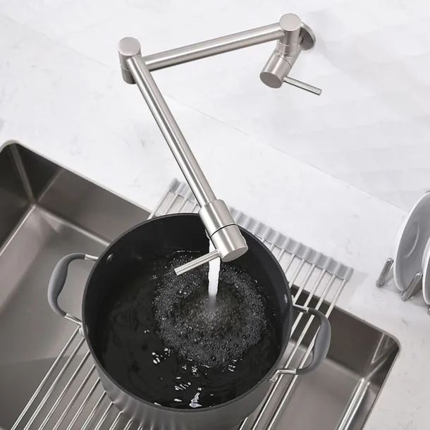 Premium Materials: The main material that this wall-mounted kitchen faucet is made out of is industrial grade brass which adds to the durability and reliability of the construction. Brushed nickel finish would undeniably complement the modern outlook of your kitchen.