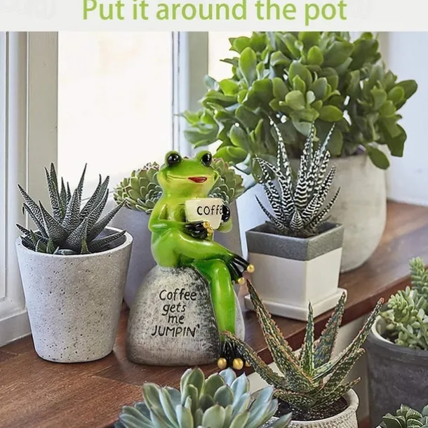 1. Add a touch of liveliness to your yard with this delightful green frog ornament! Featuring a charming frog adorably holding a cup of coffee while sitting on a stone, this creative decoration is sure to bring a smile to your face.