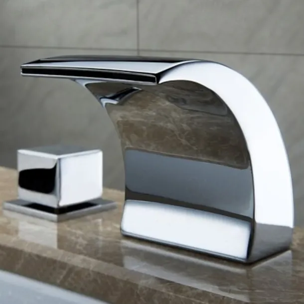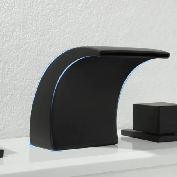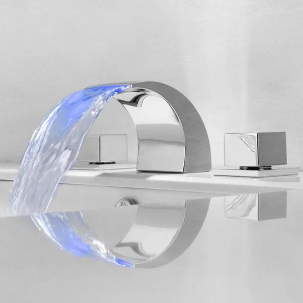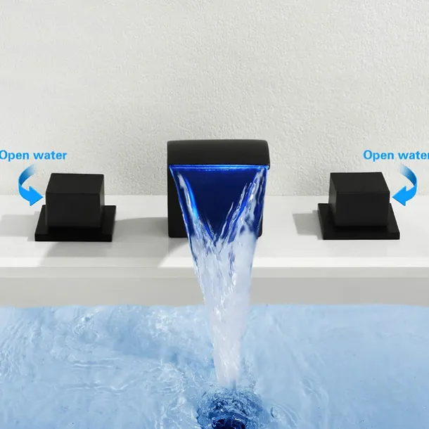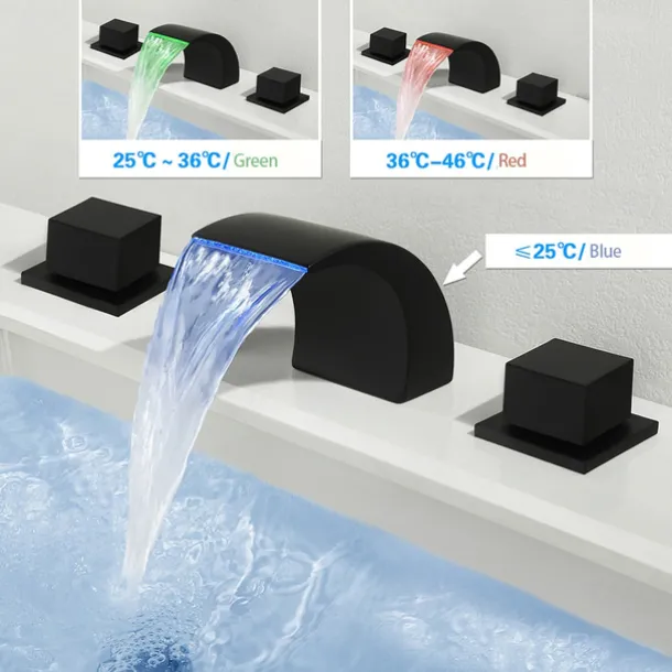 - Deck mounted 3 holes dual handle, The waterfall spout delivers a graceful sheet of LED water to make any washing a blissful experience while pleasing your eyes.